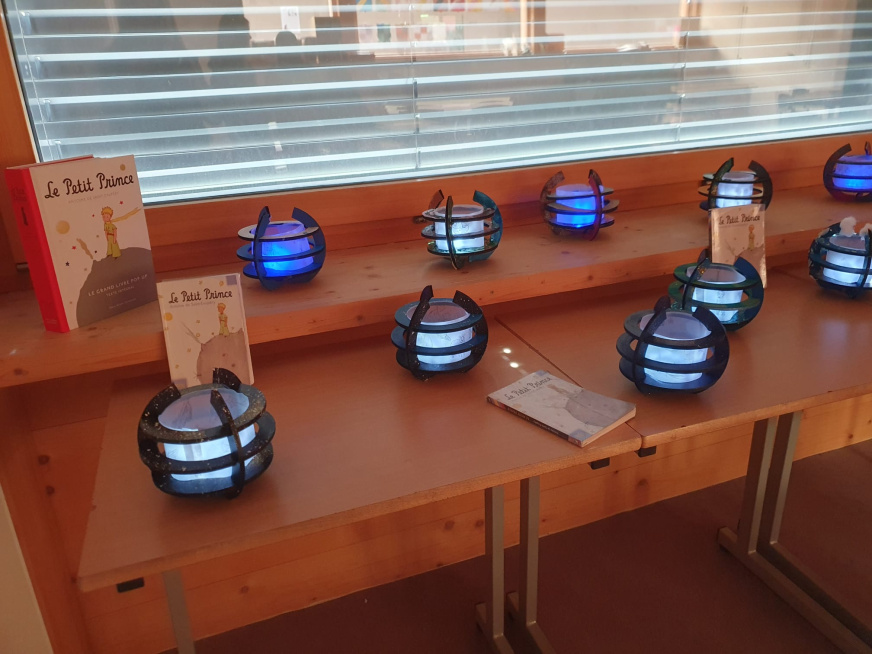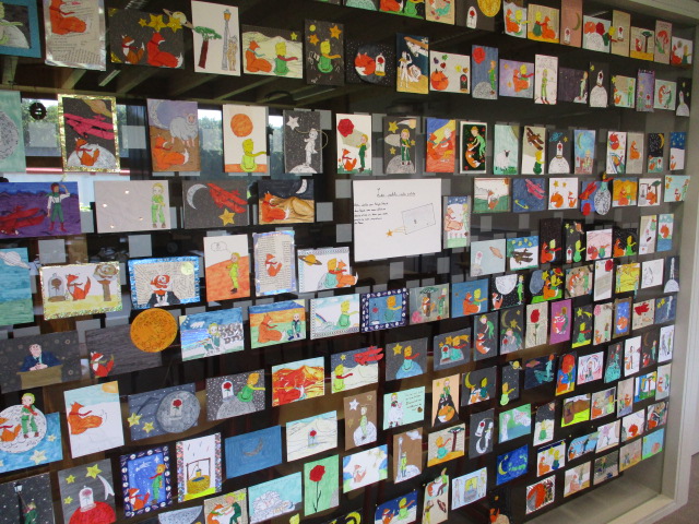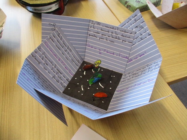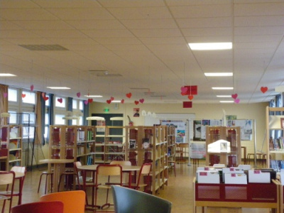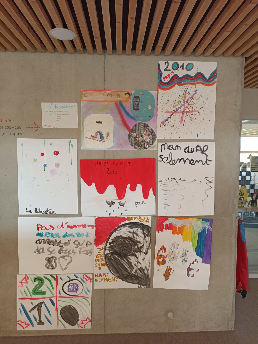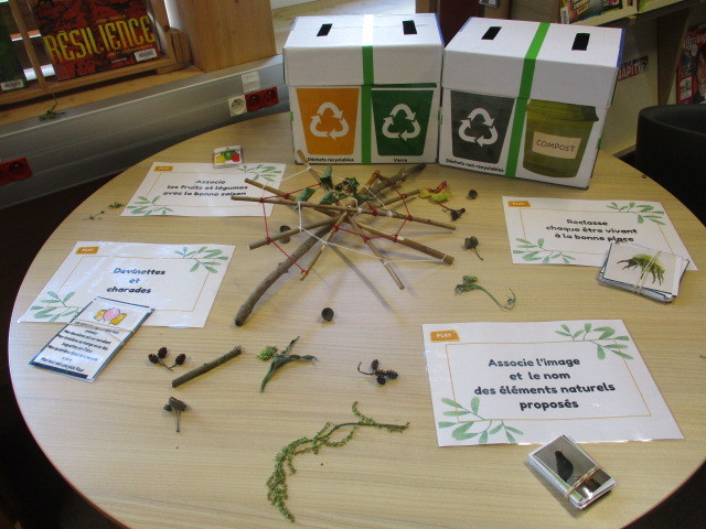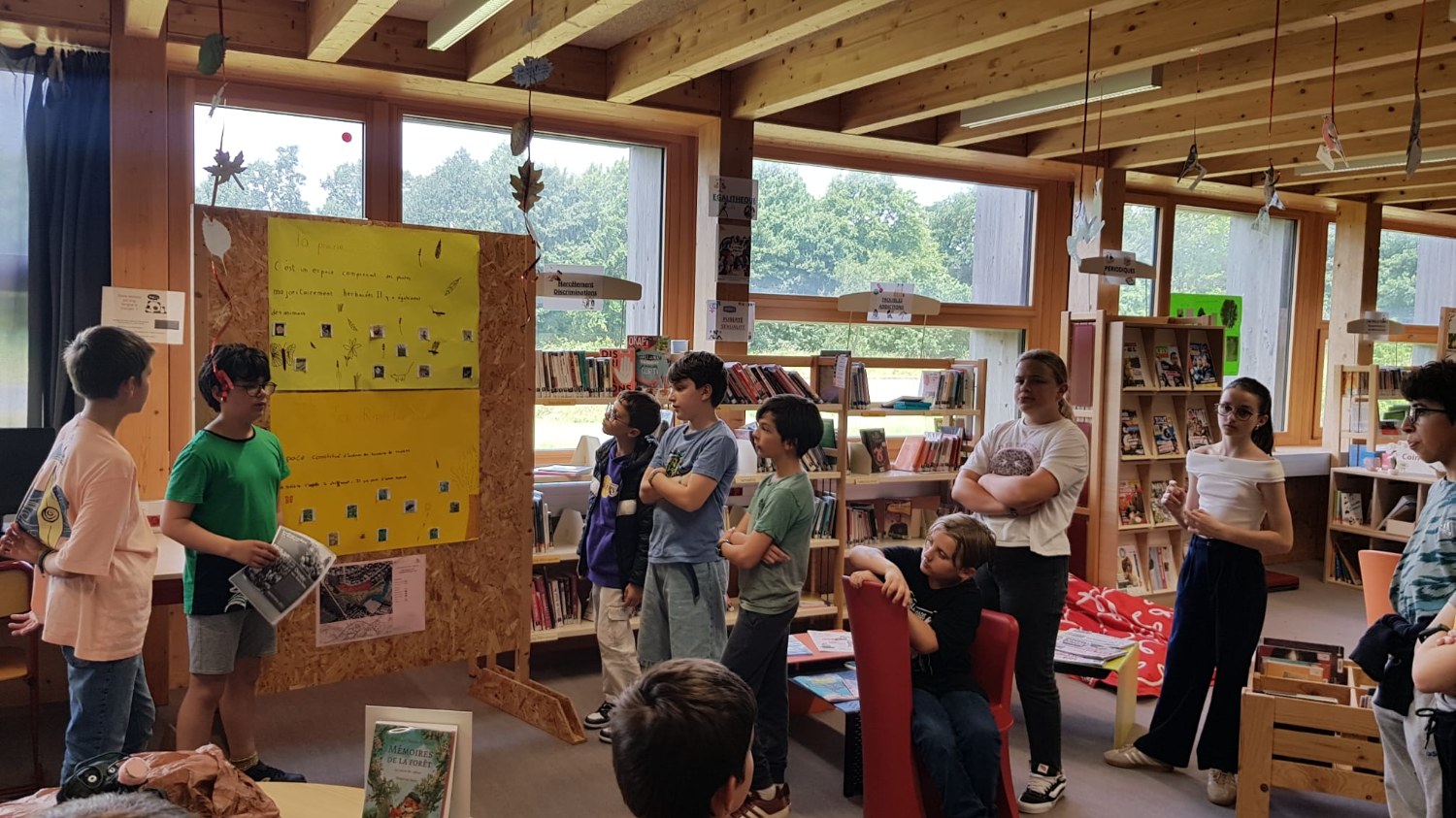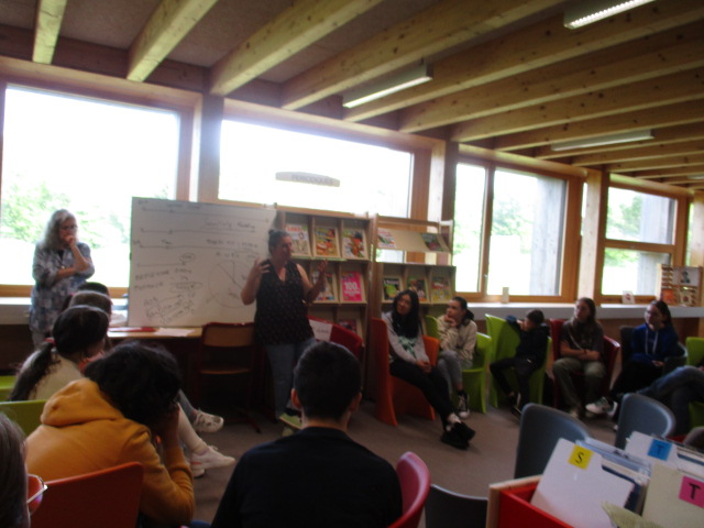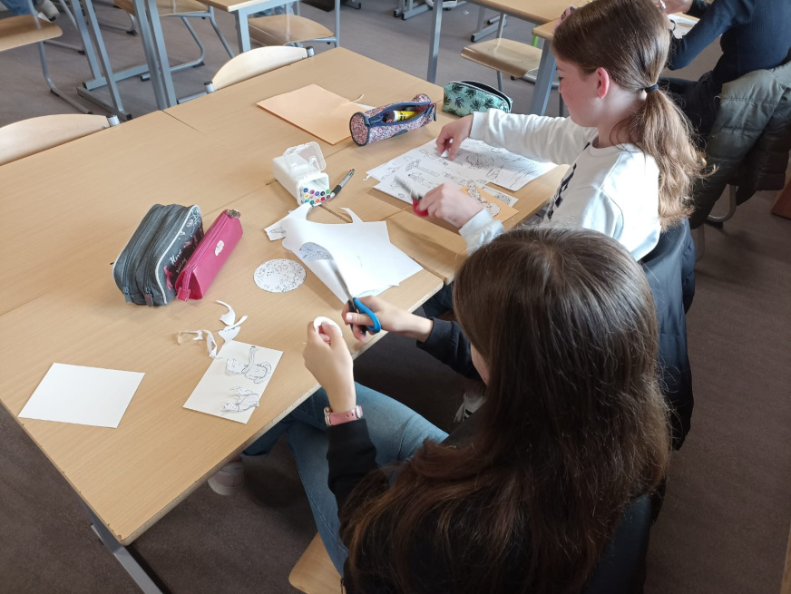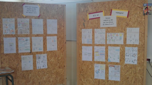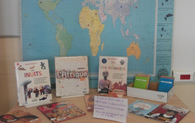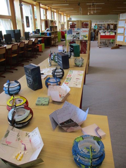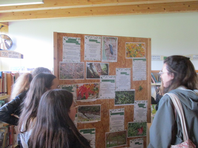 Mme Doux, professeure-documentaliste du CDI du collège, a accueilli une exposition des créations des élèves de 6D en lien avec l’ATE.