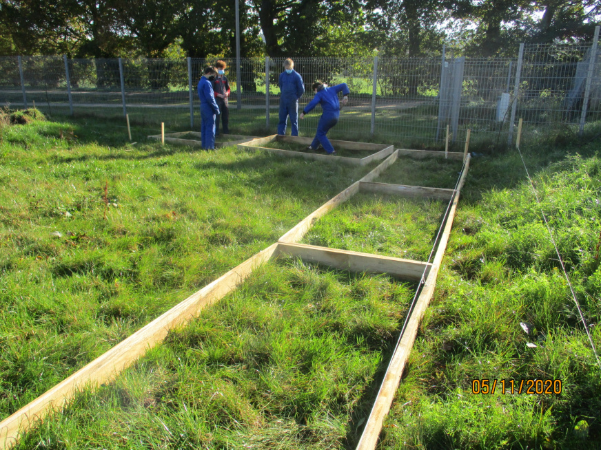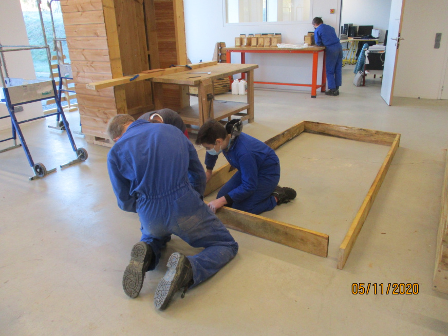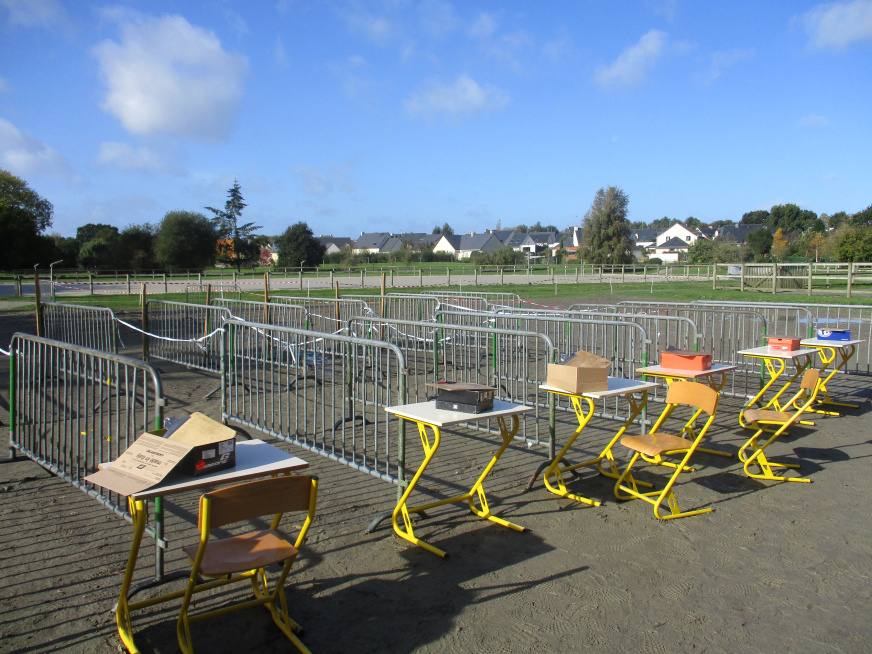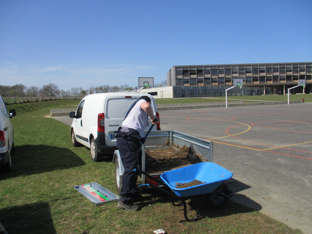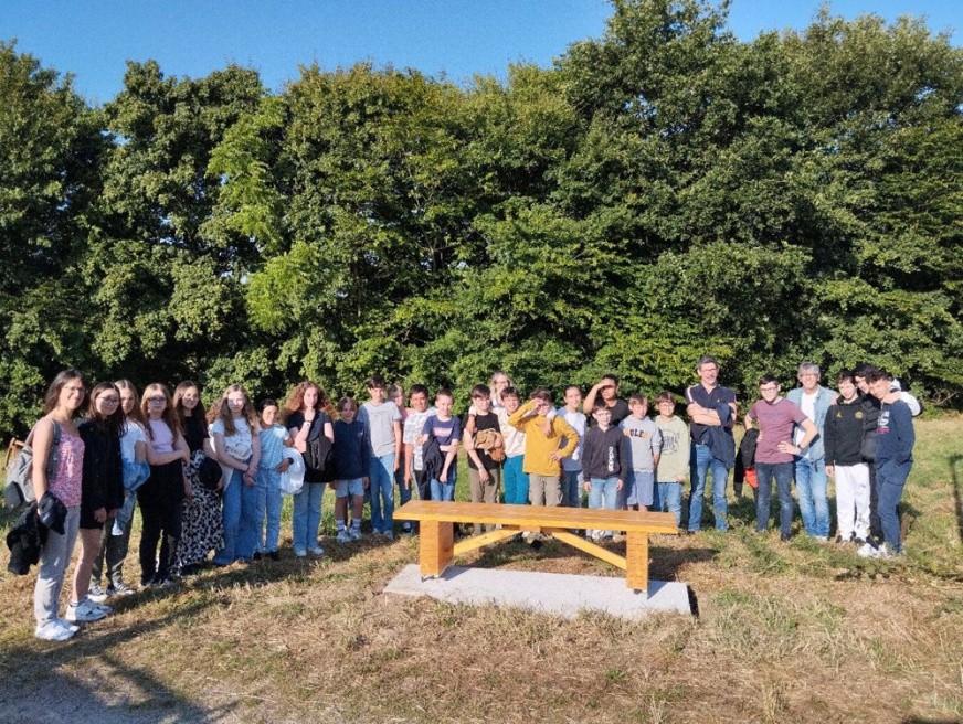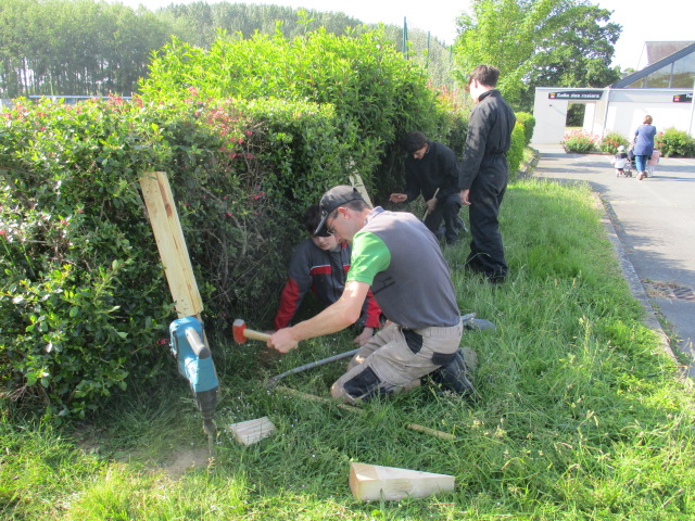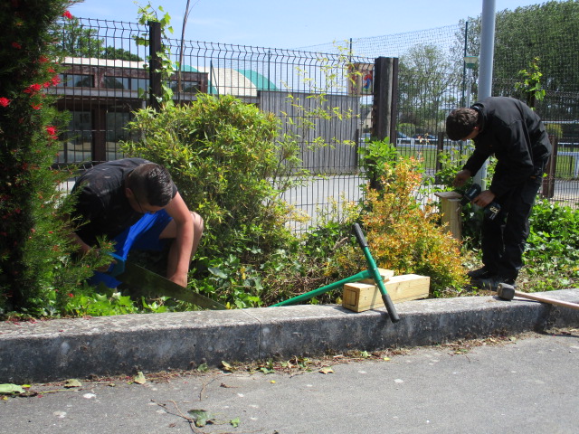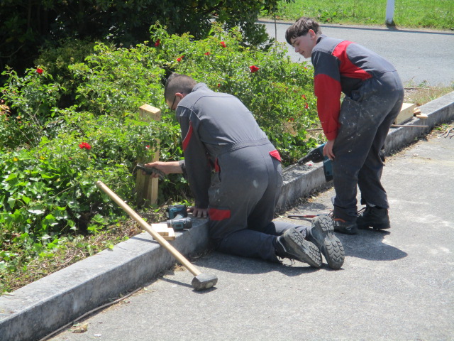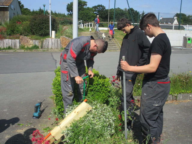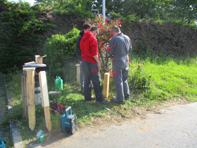 Installation des bancs sur l’aire : Les bancs confectionnés par les ateliers Segpa du collège avec le soutien des services techniques de Lamballe ont été installés sur la zone de l’aire.