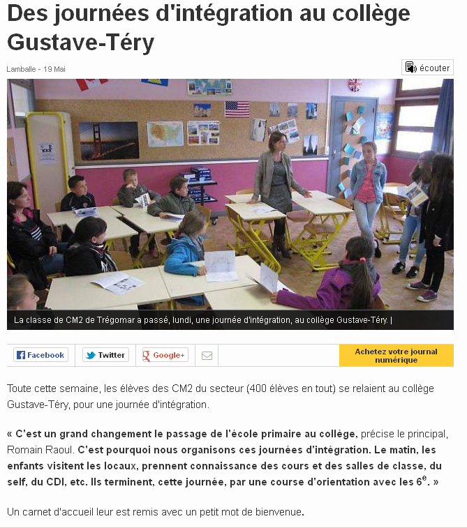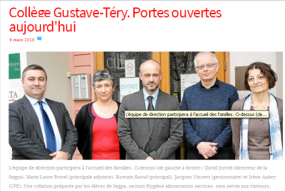 Ouverture pédagogique enfin, avec la mise en place progressive de la réforme du collège, puis l’écriture d’un nouveau projet d’établissement, dont la principale préoccupation sera d’accompagner au mieux nos élèves tout au long de leur scolarité à Gustave Téry, en les préparant à leur arrivée mais aussi en les guidant au mieux après la 3e : pour que le passage au collège ne soit plus une rupture, mais un nouvel élan !