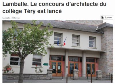 Le projet du nouveau collège public de Lamballe est bien lancé avec le concours d’architecte. Les travaux devraient commencer en septembre 2016.
