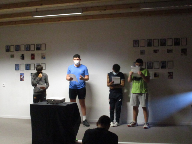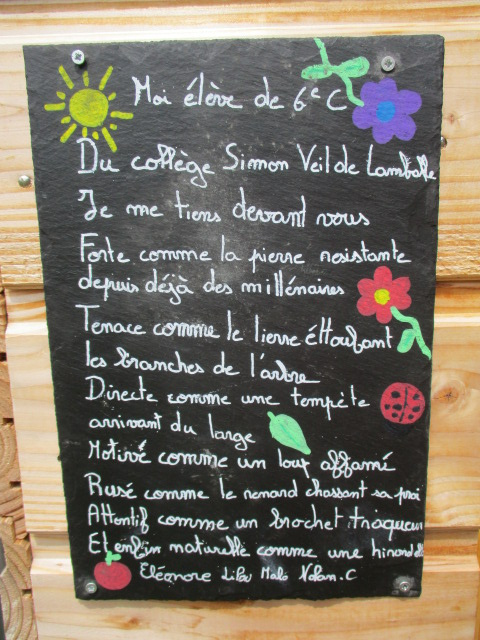 Les élèves ont préparé une exposition sur le travail réalisé cette année. Le vernissage en présence de Camille Cauret , des 4 professeurs impliqués, la classe de 6E, les éco-délégués du club (volontaires), Judith Houdmon de La Ligue de l’Enseignement, Serge de l’association « Comptoirs des arts » et des représentants de l’atelier Segpa a permis d’inaugurer cette expo et de montrer le travail réalisé tout au long de l’année. Particulièrement l’écriture de poèmes en relation avec les photos prises sur l’ATE.
