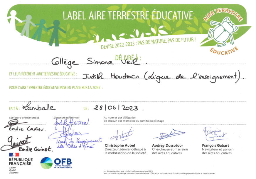 Une aire éducative est une zone terrestre de petite taille, plus ou moins anthropisée (chemin, passerelle, ripisylve, haie bocagère, etc.), gérée de manière participative par les élèves d’une classe de sixième, cette année la 6C. La zone, prêtée par la mairie de Lamballe, est à proximité du collège. Accompagnés par de nombreux enseignants (SVT, Histoire Géographie EMC, Mathématiques, Arts Plastiques, Anglais, Documentation et Français), une enseignante coordinatrice, Emilie Guinot, et Judith Houdmon, la référente spécialisée dans l’éducation à l’environnement, les élèves étudient cette aire et décident de façon démocratique des actions à y mener pour préserver la biodiversité qui s’y trouve ainsi que son patrimoine naturel et culturel. A travers ce projet, ils développent les compétences et les notions du programme scolaire et découvrent leur territoire et ses acteurs, la commune de Lamballe, la mairie, mais aussi des associations de protection de l’environnement, comme la Ligue de l’Enseignement et l’Office Français pour la Biodiversité, et d’autres acteurs du territoire, comme le Comptoir des Arts.